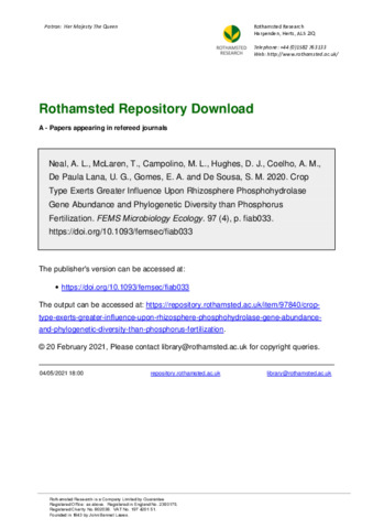 Crop Type Exerts Greater Influence Upon Rhizosphere Phosphohydrolase Gene Abundance and Phylogenetic Diversity than Phosphorus Fertilization.