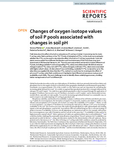 Field data about the effect of soil pH on phosphorus (P) cycling is limited. A promising tool to study P cycling under field conditions is the 18O:16O ratio of phosphate (δ18OP). In this study we investigate whether the δ18OP can be used to elucidate the effect soil pH on P cycling in grasslands. Soils and plants were sampled from different fertilisation and lime treatments of the Park Grass long term experiment at Rothamsted Research, UK. The soils were sequentially extracted to isolate different soil P pools, including available P and corresponding δ18OP values were determined. We did not observe changes in plant δ18OP value, but soil P δ18OP values changed, and lower δ18OP values were associated with higher soil pH values. At sites where P was not limiting, available P δ18OP increased by up to 3‰ when lime was applied. We show that the δ18OP method is a useful tool to investigate the effect of pH on soil P cycling under field conditions as it highlights that different soil processes must govern P availability as pH shifts. The next challenge is now to identify these underlying processes, enabling better management of soil P at different pH.