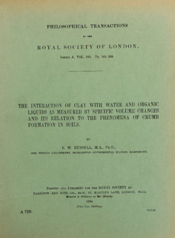 The interaction of clay with water and organic liquids as measured by specific volume changes and its relation to the phenomena of crumb formation in soils.