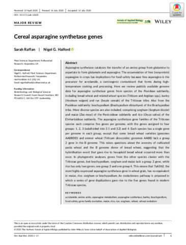 Asparagine synthetase catalyses the transfer of an amino group from glutamine to aspartate to form glutamate and asparagine. The accumulation of free (non-protein) asparagine in crops has implications for food safety because free asparagine is the precursor for acrylamide, a carcinogenic contaminant that forms during high-temperature cooking and processing. Here we review publicly-available genome data for asparagine synthetase genes from species of the Pooideae subfamily, including bread wheat and related wheat species (Triticum and Aegilops spp.), barley (Hordeum vulgare) and rye (Secale cereale) of the Triticeae tribe. Also from the Pooideae subfamily: brachypodium (Brachypodium dystachion) of the Brachypodiae tribe. More diverse species are also included, comprising sorghum (Sorghum bicolor) and maize (Zea mays) of the Panicoideae subfamily, and rice (Oryza sativa) of the Ehrhartoideae subfamily. The asparagine synthetase gene families of the Triticeae species each comprise five genes per genome, with the genes assigned to four groups: 1, 2, 3 (subdivided into 3.1 and 3.2) and 4. Each species has a single gene per genome in each group, except that some bread wheat varieties (genomes AABBDD) and emmer wheat (Triticum dicoccoides; genomes AABB) lack a group 2 gene in the B genome. This raises questions about the ancestry of cultivated pasta wheat and the B genome donor of bread wheat, suggesting that the hybridisation event that gave rise to hexaploid bread wheat occurred more than once. In phylogenetic analyses, genes from the other species cluster with the Triticeae genes, but brachypodium, sorghum and maize lack a group 2 gene, while rice has only two genes, one group 3 and one group 4. This means that TaASN2, the most highly expressed asparagine synthetase gene in wheat grain, has no equivalent in maize, rice, sorghum or brachypodium. An evolutionary pathway is proposed in which a series of gene duplications gave rise to the five genes found in modern Triticeae species.
