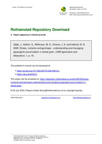 | Keywords | Asparagine, Food security and nutrition, Wheat, Plant stress, Metabolic signalling, Crop management, Nitrogen mobilisation, Ammonia detoxification |