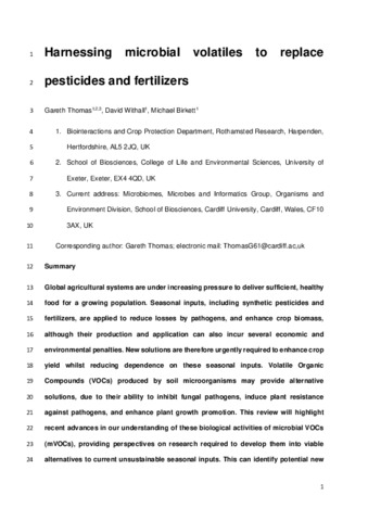 Global agricultural systems are under increasing pressure to deliver sufficient, healthy food for a growing population. Seasonal inputs, including synthetic pesticides and fertilizers, are applied to reduce losses by pathogens, and enhance crop biomass, although their production and application can also incur several economic and environmental penalties. New solutions are therefore urgently required to enhance crop yield whilst reducing dependence on these seasonal inputs. Volatile Organic Compounds (VOCs) produced by soil microorganisms may provide alternative solutions, due to their ability to inhibit fungal pathogens, induce plant resistance against pathogens, and enhance plant growth promotion. This review will highlight recent advances in our understanding of these biological activities of microbial VOCs (mVOCs), providing perspectives on research required to develop them into viable alternatives to current unsustainable seasonal inputs. This can identify potential new avenues for mVOC research and stimulate discussion across the academic community 25 and agri-business sector.