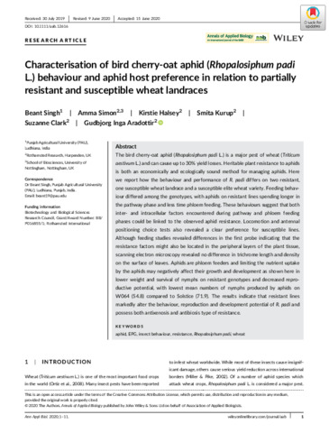 Characterisation of bird cherry-oat aphid (Rhopalosiphum padi L.) behaviour and aphid host preference in relation to partially resistant and susceptible wheat landraces