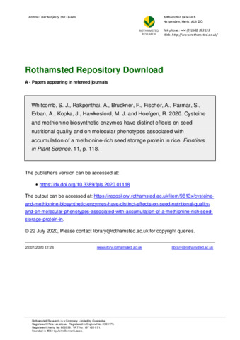 Cysteine and methionine biosynthetic enzymes have distinct effects on seed nutritional quality and on molecular phenotypes associated with accumulation of a methionine-rich seed storage protein in rice.