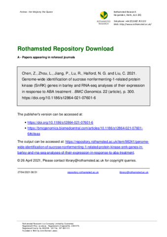| Keywords | Barley, Hordeum vulgare, SnRK, Sucrose nonfermenting-1, Gene family, Abscisic acid, Metabolic regulation, Stress responses |