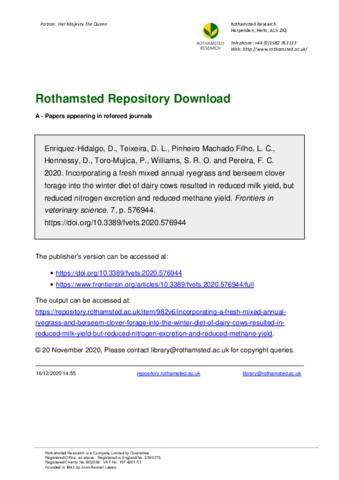 Incorporating a fresh mixed annual ryegrass and berseem clover forage into the winter diet of dairy cows resulted in reduced milk yield, but reduced nitrogen excretion and reduced methane yield
