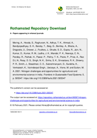 In the last six decades, the consumption of reactive nitrogen (Nr) in the form of fertilizer in India has been growing rapidly, whilst the nitrogen use efficiency (NUE) of cropping systems has been decreasing. These trends have led to increasing environmental losses of Nr, threatening the quality of air, soils, and fresh waters, and thereby endangering climate-stability, ecosystems, and human-health. Since it has been suggested that the fertilizer consumption of India may double by 2050, there is an urgent need for scientific research to support better nitrogen management in Indian agriculture. In order to share knowledge and to develop a joint vision, experts from the UK and India came together for a conference and workshop on “Challenges and Opportunities for Agricultural Nitrogen Science in India.” The meeting concluded with three core messages: (1) Soil stewardship is essential and legumes need to be planted in rotation with cereals to increase nitrogen fixation in areas of limited Nr availability. Synthetic symbioses and plastidic nitrogen fixation are possibly disruptive technologies, but their potential and implications must be considered. (2) Genetic diversity of crops and new technologies need to be shared and exploited to reduce N losses and support productive, sustainable agriculture livelihoods. Móring et al. Nitrogen Challenges and Opportunities (3) The use of leaf color sensing shows great potential to reduce nitrogen fertilizer use (by 10–15%). This, together with the usage of urease inhibitors in neem-coated urea, and better management of manure, urine, and crop residues, could result in a 20–25% improvement in NUE of India by 2030.