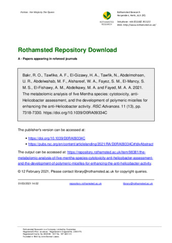 | Keywords | Metabolomics, Mentha, Cytotoxics, Anti-Helicobacter |