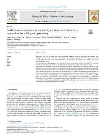 Key findings and conclusions: This reveals that endosperm is not homogeneous, but exhibits gradients in composition from the outer to the inner part. These include gradients in both amount and composition. For example, the content of gluten proteins decreases but the proportion of glutenin polymers increases from the outside to the centre of the tissue. However, the content of starch increases with changes in the granule size distribution, the proportions of amylose and amylopectin, and their thermal properties. Hence these parts of the endosperm differ in the functional properties for food processing. Gradients also exist in minor components which may affect health and processing, such as dietary fibre and lipids. The gradients in grain composition are reflected in differences in the compositions of the mill streams which are combined to give white flour (which may number over 20). These differences could therefore be exploited by millers and food processors to develop flours with compositions and properties for specific end uses.