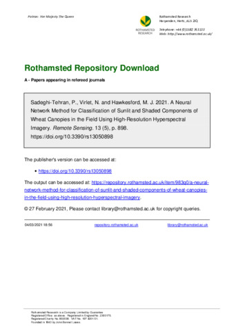 A Neural Network Method for Classification of Sunlit and Shaded Components of Wheat Canopies in the Field Using High-Resolution Hyperspectral Imagery