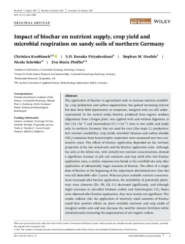 The application of biochar to agricultural soils to increase nutrient availability, crop production and carbon sequestration has gained increasing interest but data from field experiments on temperate, marginal soils are still under‐represented. In the current study, biochar, produced from organic residues (digestates) from a biogas plant, was applied with and without digestates at low (3.4 t ha−1) and intermediate (17.1 t ha−1) rates to two acidic and sandy soils in northern Germany that are used for corn (Zea mays L.) production. Soil nutrient availability, crop yields, microbial biomass and carbon dioxide (CO2) emissions from heterotrophic respiration were measured over two consecutive years. The effects of biochar application depended on the intrinsic properties of the two tested soils and the biochar application rates. Although the soils at the fallow site, with initially low nutrient concentrations, showed a significant increase in pH, soil nutrients and crop yield after low biochar application rates, a similar response was found at the cornfield site only after application of substantially larger amounts of biochar. The effect of a single dose of biochar at the beginning of the experiment diminished over time but was still detectable after 2 years. Whereas plant available nutrient concentrations increased after biochar application, the availability of potentially phytotoxic trace elements (Zn, Pb, Cd, Cr) decreased significantly, and although slight increases in microbial biomass carbon and heterotrophic CO2 fluxes were observed after biochar application, they were mostly not significant. The results indicate that the application of relatively small amounts of biochar could have positive effects on plant available nutrients and crop yields of marginal arable soils and may decrease the need for mineral fertilizers while simultaneously increasing the sequestration of soil organic carbon.