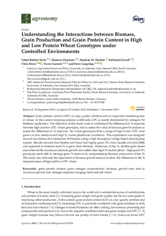 | Keywords | Grain protein content, Grain nitrogen concentration, Biomass, Growth rate, Time to maximum growth rate, Nitrogen response, Imaging, Hard and soft wheat |