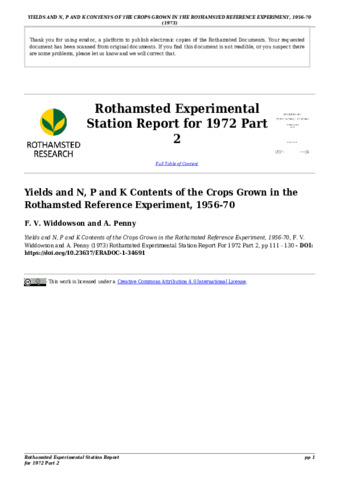 Yields and N, P and K Contents of the Crops Grown in the Rothamsted Reference Experiment, 1956-70,