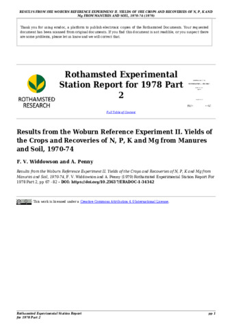 Results from the Woburn Reference Experiment II. Yields of the Crops and Recoveries of N, P, K and Mg from Manures and Soil, 1970-74.