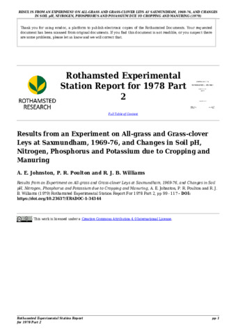 Results from an Experiment on All-grass and Grass-clover Leys at Saxmundham, 1969-76, and Changes in Soil pH, Nitrogen, Phosphorus and Potassium due to Cropping and Manuring