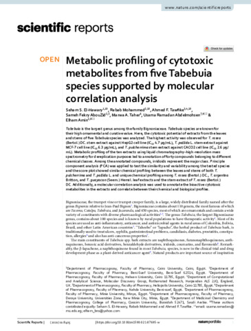 Tabebuia is the largest genus among the family Bignoniaceae. Tabebuia species are known for their high ornamental and curative value. Here, the cytotoxic potential of extracts from the leaves and stems of fve Tabebuia species was analyzed. The highest activity was observed for T. rosea (Bertol.) DC. stem extract against HepG2 cell line (IC50 4.7 µg/mL), T. pallida L. stem extract against MCF-7 cell line (IC50 6.3 µg/mL), and T. pulcherrima stem extract against CACO2 cell line (IC50 2.6 µg/mL). Metabolic profiling of the ten extracts using liquid chromatography–high-resolution mass spectrometry for dereplication purposes led to annotation of forty compounds belonging to diferent chemical classes. Among the annotated compounds, irridoids represent the major class. Principle component analysis (PCA) was applied to test the similarity and variability among the tested species and the score plot showed similar chemical profling between the leaves and stems of both T. pulcherrima and T. pallida L. and unique chemical profling among T. rosea (Bertol.) DC., T. argentea Britton, and T. guayacan (Seem.) Hemsl. leaf extracts and the stem extract of T. rosea (Bertol.) DC. Additionally, a molecular correlation analysis was used to annotate the bioactive cytotoxic metabolites in the extracts and correlate between their chemical and biological profles.