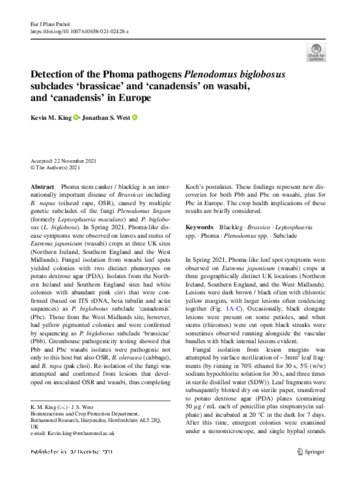 Detection of the Phoma pathogens Plenodomus biglobosus subclades ‘brassicae’ and ‘canadensis’ on wasabi, and ‘canadensis’ in Europe