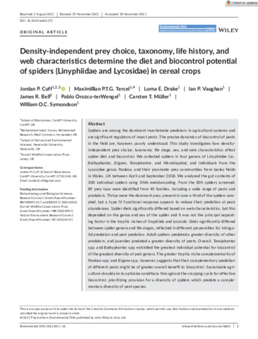 Density-independent prey choice, taxonomy, life history, and web characteristics determine the diet and biocontrol potential of spiders (Linyphiidae and Lycosidae) in cereal crops