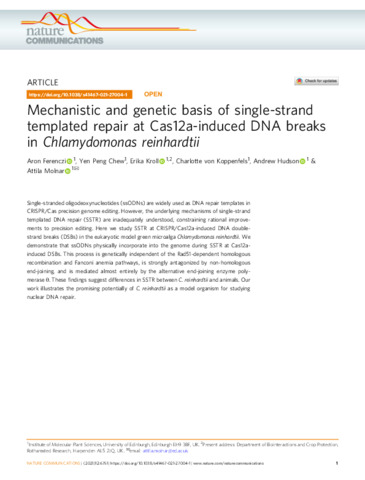 Mechanistic and genetic basis of single-strand templated repair at Cas12a-induced DNA breaks in Chlamydomonas reinhardtii