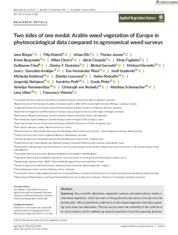 Conclusion This comparison of arable weed data that were originally sampled with a different purpose represents a new effort in connecting research between vegetation scientists and weed scientists. Both collections show different aspects of weed vegetation, which means the joint use of the data is valuable as it can contribute to a more complete picture of weed species diversity in European arable landscapes.