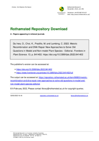 Meiotic Recombination and DNA Repair New Approaches to Solve Old Questions in Model and Non-model Plant Species - Editorial.