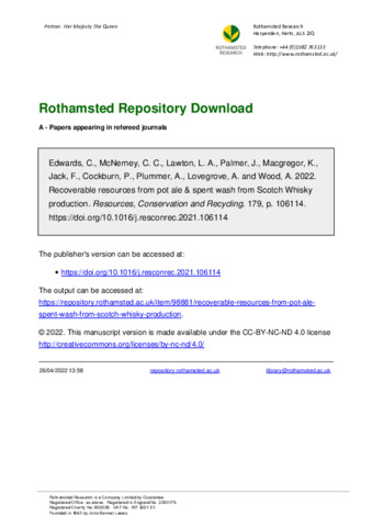 | Keywords | Pot ale, Resource recovery, Lactic acid, Magnesium, Critical raw materials, Phosphate |