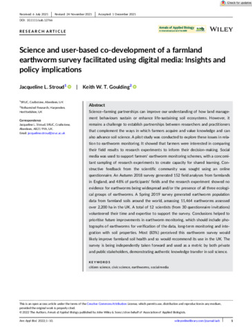 Science–farming partnerships can improve our understanding of how land management behaviours sustain or enhance life-sustaining soil ecosystems. However, it remains a challenge to establish partnerships between researchers and practitioners that complement the ways in which farmers acquire and value knowledge and can also advance soil science. A pilot study was conducted to explore these issues in relation to earthworm monitoring. It showed that farmers were interested in comparing their field results to research experiments to inform their decision-making. Social media was used to support farmers' earthworm monitoring schemes, with a concomitant sampling of research experiments to create capacity for shared learning. Constructive feedback from the scientific community was sought using an online questionnaire. An Autumn 2018 survey generated 152 field analyses from farmlands in England, and 48% of participants' fields and the research experiment showed no evidence for earthworms being widespread and/or the presence of all three ecological groups of earthworms. A Spring 2019 survey generated earthworm population data from farmland soils around the world, amassing 11,464 earthworms assessed over 2,200 ha in the UK. A total of 12 scientists (from 30 questionnaire invitations) volunteered their time and expertise to support the survey. Conclusions helped to prioritise future improvements in earthworm monitoring, which should include photographs of earthworms for verification of the data, long-term monitoring and integration with soil properties. Most (83%) perceived this earthworm survey would likely improve farmland soil health and so would recommend its use in the UK. The survey is being independently taken forward and used as a metric by both private and public stakeholders, demonstrating authentic knowledge transfer in soil science.