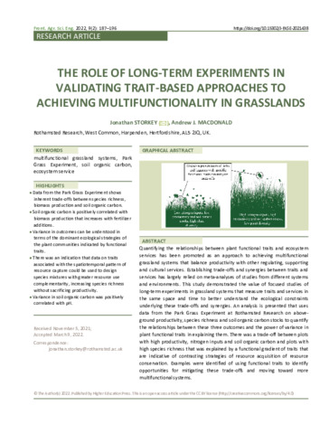 Quantifying the relationships between plant functional traits and ecosystem services has been promoted as an approach to achieving multifunctional grassland systems that balance productivity with other regulating, supporting and cultural services. Establishing trade-offs and synergies between traits and services has largely relied on meta-analyses of studies from different systems and environments. This study demonstrated the value of focused studies of long-term experiments in grassland systems that measure traits and services in the same space and time to better understand the ecological constraints underlying these trade-offs and synergies. An analysis is presented that uses data from the Park Grass Experiment at Rothamsted Research on above-ground productivity, species richness and soil organic carbon stocks to quantify the relationships between these three outcomes and the power of variance in plant functional traits in explaining them. There was a trade-off between plots with high productivity, nitrogen inputs and soil organic carbon and plots with high species richness that was explained by a functional gradient of traits that are indicative of contrasting strategies of resource acquisition of resource conservation. Examples were identified of using functional traits to identify opportunities for mitigating these trade-offs and moving toward more multifunctional systems.
