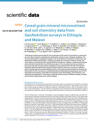 The dataset comprises primary data for the concentration of 29 mineral micronutrients in cereal grains and up to 84 soil chemistry properties from GeoNutrition project surveys in Ethiopia and Malawi. The work provided insights on geospatial variation in the micronutrient concentration in staple crops, and the potential influencing soil factors. In Ethiopia, sampling was conducted in Amhara, Oromia, and Tigray regions, during the late-2017 and late-2018 harvest seasons. In Malawi, national-scale sampling was conducted during the April–June 2018 harvest season. The concentrations of micronutrients in grain were measured using inductively coupled plasma mass spectrometry (ICP-MS). Soil chemistry properties reported include soil pH; total soil nitrogen; total soil carbon (C); soil organic C; effective cation exchange capacity and exchangeable cations; a three-step sequential extraction scheme for the fractionation of sulfur and selenium; available phosphate; diethylenetriaminepentaacetic acid (DTPA)-extractable trace elements; extractable trace elements using 0.01 M Ca(NO3)2 and 0.01 M CaCl2; and isotopically exchangeable Zn. These data are reported here according to FAIR data principles to enable users to further explore agriculture-nutrition linkages.