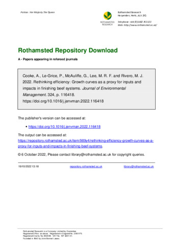 Quantifying and improving efficiency within beef systems is essential for economic and environmental sustainability. The industry standard for assessing efficiency is liveweight gain per day, however, this metric is limited in that it values each day of a growing animal’s life as equally costly, despite the increasing maintenance requirements, inputs, and emissions associated with increasing liveweight. Quantifying the area under the growth curve (AUC) considers both time and liveweight as a cost and therefore may hold potential as a better estimate of cost, impact, and efficiency in beef systems. Liveweight data was taken from 439 finishing beef cattle split across three herds grazing on different pastures, known as ‘farmlets’. Analysis was conducted in three parts: [1] Validation of AUC as a proxy for costs using data from a sub-set of 87 animals that had been part of a previous life cycle analysis (LCA) study in which dry matter intake (DMI), methane emissions (CH 4 ), and nitrous oxide emissions (N 2O) were calculated. [2] Calculation of AUC relative to liveweight gain (LWG AUC -1) and comparison of that metric against the industry standard of liveweight gain per day (LWG day -1) [3] Assessment of how LWG AUC -1 varied with breed, sex, and management. When comparing to LCA results, AUC correlated significantly with DMI (r = 0.886), CH 4 ( r = 0.788) and N 2 O ( r = 0.575) emissions. Over the full dataset, there was a negative non-linear relationship between LWG AUC -1 and slaughter age ( r = -0.809). There was a significant difference in LWG AUC -1 between breeds ( p = 0.046) and farmlets ( p = 0.028), but not sex ( p = 0.388). LWG AUC -1 has the potential to act as a proxy for feed intake and emissions. In that regard it is superior to LWG day -1 , whilst requiring no additional data. Results highlighted the decreasing efficiency of beef cattle over time and the potential benefits of earlier slaughter. The use of LWG AUC -1 could allow farmers to improve their understanding of efficiency within their herds, aiding informed management decision making.