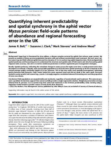 BACKGROUND Sugar beet is threatened by virus yellows, a disease complex vectored by aphids that reduces sugar content. We present an analysis of Myzus persicae population dynamics with and without neonicotinoid seed treatment. We use six years’ yellow water trap and field-collected aphid data and two decades of 12.2 m suction-trap aphid migration data. We investigate both spatial synchrony and forecasting error to understand the structure and spatial scale of field counts and why forecasting aphid migrants lacks accuracy. Our aim is to derive statistical parameters to inform regionwide pest management strategies.
