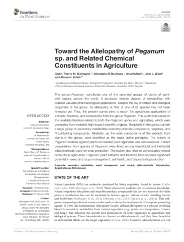The genus Peganum constitutes one of the perennial groups of plants of semi-arid regions across the world. It produces diverse classes of metabolites with claimed valuable pharmacological applications. Despite the key chemical and biological properties of the genus, its allelopathy or that of one of its species has not been reviewed yet. Thus, the present survey aims to report the agricultural applications of extracts, fractions, and compounds from the genus Peganum. This work was based on the available literature related to both the Peganum genus and agriculture, which were generated from available high-impact scientific engines. The plants in this genus contain a large group of secondary metabolites including phenolic compounds, terpenes, and N-containing compounds. Alkaloids, as the main components of the extracts from plants in the genus, were identified as the major active principles. The toxicity of Peganum isolates against plants and related pest organisms was also reviewed. Extract preparations from species of Peganum were listed among insecticidal and herbicidal allelochemicals used for crop protection. The review also tried to contextualize natural products in agriculture. Peganum plant extracts and fractions have showed significant potential in weed and crops management, soil health, and biopesticide production.