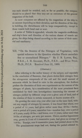 On the source of the nitrogen of vegetation; with special reference to the question whether plants assimilate free or uncombined nitrogen