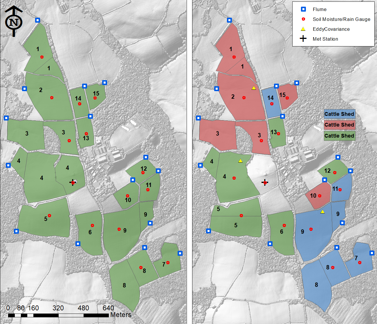 | Data collection method | This dataset contains water quality information of combined surface and subsurface runoff, taken from catchments on the NWFP. The NWFP is separated into three self-contained farms (“farmlets”) which are managed according to different operational philosophies or practices, and these farming systems are updated periodically. During the period over which this dataset was collected, the three 22ha farmlets were all pasture based and used for livestock production in the form of a beef herd and sheep flock. From 2010 to between 2013 and 2015 (depending on the catchment) the farmlets were all under permanent pasture (map 1 in figure) and are referred to as the ‘baseline’ period in the Treatment column of the data. The first system change period (2013/5 to 2019, map 2 in figure) was either a reseed with innovative grass species with desirable traits (‘reseed’ in the Treatment column of the data), reseeded with a mixture of white clover and the same innovative grass species (‘legumes’), or continued permanent pasture (‘permanent pasture’). The catchments of the NWFP are hydrologically isolated, and the highly impermeable subsoil means that water moving as surface or subsurface runoff is captured by a bounding drainage system and directed towards a flume, with one flume per catchment. Each farmlet consists of five catchments (with each consisting of one or two fields) and are highly instrumented and monitored, allowing the collection of a wide variety of environmental data to complement agricultural production data. Core NWFP datasets are open and include in-situ water flow and chemistry taken at 15-minute intervals; 15-minute Met measurements; 15-minute soil moisture measurements; 30-minute GHG emissions; soils, crop and botanical field survey data; livestock and crop performance data; and farm operational activities (see related output). In this dataset, samples were collected either as grab-samples (bottles put under the flow of water at the flume) or via ISCO autosamplers set up to sample the flume water. The date and time of the sample being taken is recorded in Datetime_lab. Brief descriptions of laboratory analyses conducted on these samples are given in Column_units_and_descriptions.csv. |
