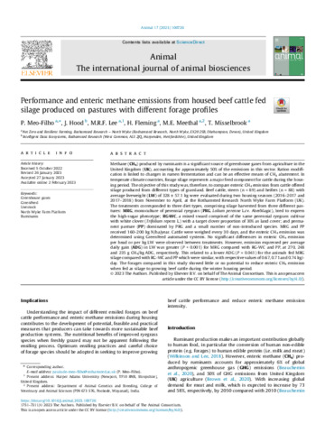 Methane (CH4) produced by ruminants is a significant source of greenhouse gases (GHG) from agriculture in the United Kingdom (UK), accounting for approximately 50% of the emissions in this sector. Ration modification is linked to changes in rumen fermentation and can be an effective means of CH4 abatement. In temperate climate countries, forage silage represents a major feed component for cattle during the housing period. The objective of this study was, therefore, to compare enteric CH4 emission from cattle offered silage produced from different types of grassland. Beef cattle, steers (n = 89) and heifers (n = 88) with average liveweight (LW) of 328 ± 57.1 kg, were evaluated during two housing seasons (2016-2017 and 2017-2018) from November to April, at the Rothamsted Research North Wyke Farm Platform (NWFP, UK). The treatments corresponded to three diet types, comprising silage harvested from three different pastures: MRG, monoculture of perennial ryegrass (PRG, Lolium perenne L.cv. AberMagic), bred to express the high sugar phenotype; RG-WC, a mixed sward comprised of the same perennial ryegrass cultivar with white clover (Trifolium repens L.) with a target clover proportion of 30% as land cover; and PP, permanent pasture dominated by PRG and a small number of non-introduced species. MRG and PP received 160-200 kg N/ha/year. Cattle were weighed every 30 days and the enteric CH4 emission was determined using GreenFeed automated systems. No significant differences in enteric CH4 emission per head or per kg LW were observed between treatments. However, emission expressed per average daily gain (ADG) in LW was greater (p<0.001) for MRG compared with RG-WC and PP, at 270, 248 and 235 g CH4/kg ADG, respectively. This related to a lower ADG (p=0.041) for the animals fed MRG silage compared with RG-WC and PP which were similar, with respective values of 0.67, 0.71 and 0.74 kg/day. The forages compared in this study showed little or no potential to reduce enteric CH4 emission when fed as silage to growing beef cattle during the winter housing period.