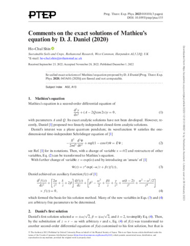 So-called exact solutions of Mathieu’s equation proposed by D. J. Daniel [Prog. Theor. Exp. Phys. 2020, 043A01 (2020)] are flawed and not computable. https://doi.org/10.1093/ptep/ptaa024