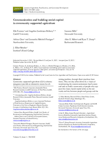 Community supported agriculture (CSA) schemes (programs) provide an alternative means for obtaining produce, through direct purchase from farms. They are also often driven by a vision of transforming the current mainstream food system and seek to build a community of people who support this vision. Social capital refers to the networks and ties between people and groups and the impact of these ties on access to influence, information, opportunity, and ability to organize. Social capital is built by CSAs and helps foster and stabilize the grassroots agricultural innovations that are needed for the development of sustainable food systems. Using the concept of social capital, we studied communication methods of four CSAs in the UK, examining the interactions between CSAs and their members and within each of their membership groups. We carried out in-depth interviews with 49 CSA members to establish what interactions they had with their CSA and with other members, and analyzed our data thematically to identify the characteristics of interactions that were important to participants. We consider how our research may benefit CSA organizations by enabling them to learn what their members want and to learn about the varied ways in which members conceptualize their experiences of community derived from their membership. We found that the various CSA communication strategies, which consist of frequent and varying virtual and face-to-face interactions, are able to promote development of both bridging and bonding social capital. Overall, there is a desire for social connection in CSA memberships. Furthermore, in CSAs where members can interact easily, there is potential for CSA membership to provide members with communication that is important as a source of both knowledge and social connection. CSAs can maximize both social capital and member satisfaction by using a range of communication media and methods to meet their members’ circumstances and preferences.