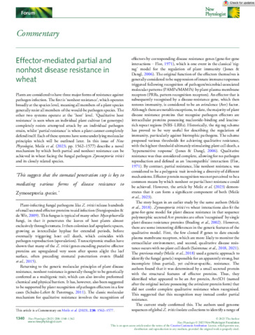 Plants are considered to have three major forms of resistance against pathogen infection. The first is ‘non host resistance’, which operates broadly at the species level, meaning all members of a plant species generally resist all members of the would-be pathogen species. The other two systems operate at the ‘host’ level. ‘Qualitative host resistance’ is seen when an individual plant cultivar (or genotype)completely resists attempted attack by an individual pathogen strain, whilst ‘partial resistance’ is when a plant cannot completely defend itself. Each of these systems have some underlying molecular principles which will be outlined later. In this issue of New Phytologist, Meile et al.(2023; pp. 1562–1577) describe a novel mechanism by which both partial and non host resistance can be achieved in wheat facing the fungal pathogen Zymoseptoria tritici and its closely related species.
