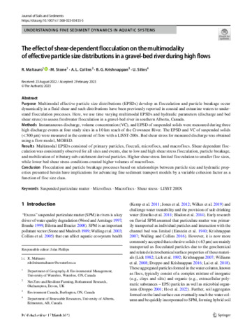 Purpose Multimodal effective particle size distributions (EPSDs) develop as flocculation and particle breakage occur dynamically in a fluid shear and such distributions have been previously reported in coastal and estuarine waters to understand flocculation processes. Here, we use time varying multimodal EPSDs and hydraulic parameters (discharge and bed shear stress) to assess freshwater flocculation in a gravel-bed river in southern Alberta, Canada.