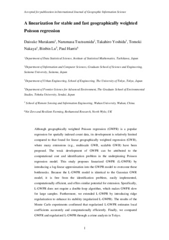 | Keywords | Identification problem, Ridge regression, Local coefficients, Log-linear approximation, Linearized geographically weighted Poisson regression |