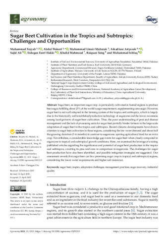 Sugar beet, an important sugar crop, is particularly cultivated in humid regions to producebeet sugar, fulfilling about 25% of the world’s sugar requirement, supplementing cane sugar. However,sugar beet is not well adopted in the farming system of the tropics and subtropics, which is largelydue to the historically well-established production technology of sugarcane and the lower awarenessamong local growers of sugar beet cultivation. Thus, the poor understanding of pest and diseasemanagement and the lack of processing units for sugar beet partially hinder farmers in the large-scaleadaptation of sugar beet in the tropics and subtropics. Recent climatic developments have drawnattention to sugar beet cultivation in those regions, considering the low water demand and about halfthe growing duration (5–6 months) in contrast to sugarcane, sparing agricultural land for an extracrop. Nevertheless, a considerable knowledge gap exists for sugar beet when closely compared tosugarcane in tropical and subtropical growth conditions. Here, we examined the leverage of existingpublished articles regarding the significance and potential of sugar beet production in the tropicsand subtropics, covering its pros and cons in comparison to sugarcane. The challenges for sugarbeet production have also been identified, and possible mitigation strategies are suggested. Ourassessment reveals that sugar beet can be a promising sugar crop in tropical and subtropical regions,considering the lower water requirements and higher salt resistance