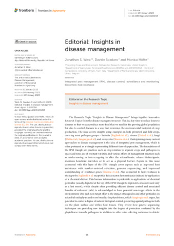 The Research Topic “Insights in Disease Management” brings together innovative Research Topics from the disease management sector. This is a key time to reduce losses to diseases so that we can produce more food that we need for the growing global population but also to control diseases in a way that minimises the environmental footprint of crop production. The issue covers insights using examples in both protected and field crops, covering most pathogen groups – bacteria (Reglinski et al.), viruses (Codod et al.), fungi (Dutta et al.; Sangiorgio et al.), and oomycetes (Sharma et al.). Underpinning many current approaches to disease management is the idea of integrated pest management, which is often portrayed as a triangle representing different tiers of approaches. The foundations of the IPM triangle are practices such as crop rotation to separate crops and pathogens in space and time, use of resistant varieties, and various effects of management practices such as under-sowing or inter-cropping to alter the microclimate, release biofumigants, maintain beneficial microbes or to act as a physical barrier. Papers in this issue connected with this layer of the IPM triangle cover aspects such as improved host resistance with marker-assisted selection, genome sequencing, and improved understanding of resistance genes (Sharma et al.). Also connected to host resistance is the paper by Reglinski et al. except that this concerns host resistance induced by application of a chemical elicitor. This human intervention is preferable to applications of chemical pesticides (usually depicted at the top of the IPM triangle to represent a measure used only as a last resort), which despite often providing efficient disease control and associated benefits of enhanced yield, is acknowledged to have potential non-target effects in the environment. One such non-target effect is the impact of fungicides and other pesticides on microbial endophytes and more broadly, the phytobiome, which Sangiorgio et al. argue, has potential to confer a degree of natural biological control, protecting against pathogens both on the plant surface and within host tissues. They review how genetic sequencing techniques are providing new insights into the degree of protection conferred by the phytobiome towards pathogens in addition to other roles affecting resistance to abiotic stress and nutrient uptake, ultimately affecting plant phenotype, growth, yield and quality. They conclude that future research on plant disease control should also consider impacts to microbe-mediated plant fitness. Indeed, even applications of biological control agents have potential to affect the phytobiome, but this approach is nevertheless regarded as less damaging to the environment compared to chemical control. One of the main biocontrol agents that has been used successfully for over 50 years is Trichoderma. This fungal genus is reviewed by Dutta et al., covering its use as a bio-fungicide, long-term biocontrol agent, defence activator and plant growth stimulator.