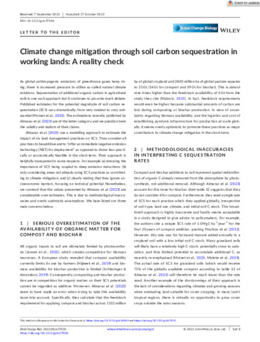 As global anthropogenic emissions of greenhouse gases keep rising, there is increased pressure to utilise so-called natural climate solutions. Sequestration of additional organic carbon in agricultural soils is one such approach but it continues to provoke much debate. Published estimates for the potential magnitude of soil carbon sequestration (SCS) vary dramatically, from very modest to very substantial (Moinet et al., 2023). The estimations recently published by Almaraz et al. (2023) are of the latter category and we question here the validity and realism of their claims.