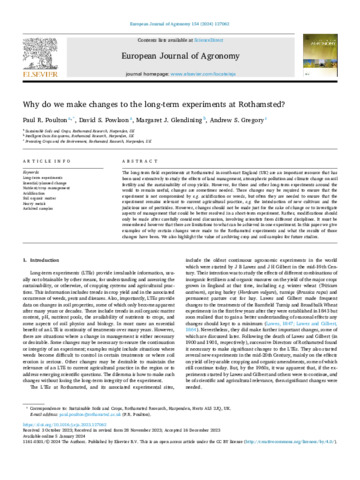 The long-term field experiments at Rothamsted in south-east England (UK) are an important resource that has been used extensively to study the effects of land management, atmospheric pollution and climate change on soil fertility and the sustainability of crop yields. However, for these and other long-term experiments around the world to remain useful, changes are sometimes needed. These changes may be required to ensure that the experiment is not compromised by e.g. acidification or weeds, but often they are needed to ensure that the experiment remains relevant to current agricultural practice, e.g. the introduction of new cultivars and the judicious use of pesticides. However, changes should not be made just for the sake of change or to investigate aspects of management that could be better resolved in a short-term experiment. Rather, modifications should only be made after carefully considered discussion, involving scientists from different disciplines. It must be remembered however that there are limitations to what can be achieved in one experiment. In this paper we give examples of why certain changes were made to the Rothamsted experiments and what the results of those changes have been. We also highlight the value of archiving crop and soil samples for future studies.