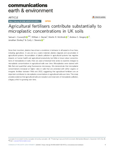 Agricultural fertilisers contribute substantially to microplastic concentrations in UK soils