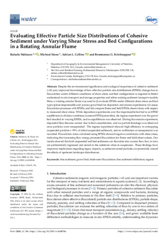 Despite the environmental significance and ecological importance of cohesive sediment (<63 μm), improved knowledge of how effective particle size distributions (EPSDs) change due to flocculation under different conditions of shear stress and bed configuration is required to better understand in situ transport and storage properties and refine existing sediment transport models. Here, a rotating annular flume was used to (i) evaluate EPSDs under different shear stress and bed types (plane-impermeable and -porous gravel bed) for deposition and erosion experiments; (ii) assess flocculation processes with EPSDs; and (iii) compare flume and field EPSDs observations with respect to measured shear stress. While deposition experiments over the impermeable bed led to an EPSD equilibrium in all shear conditions (constant EPSD percentiles), the ingress experiment over the gravel bed resulted in varying EPSDs, and no equilibrium was observed. During the erosion experiment, deposited flocs became coarser due to bed consolidation, and no particle breakage was observed once particles were resuspended. The ingress experiment showed high efficiency in entrapping suspended particles (~95% of initial suspended sediment), and no exfiltration or resuspension was recorded. Flocculation ratios calculated using EPSDs showed negative correlations with shear stress, indicating that increasing flow energy promoted flocculation for flume and field observations. Our results showed that both suspended and bed sediments can flocculate into coarser flocs that, in turn, are preferentially ingressed and stored in the substrate when in suspension. These findings have important implications regarding legacy impacts, as substrate-stored particles can potentially extend the effects of upstream landscape disturbances.