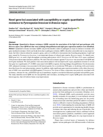 Novel gene loci associated with susceptibility or cryptic quantitative resistance to Pyrenopeziza brassicae in Brassica napus
