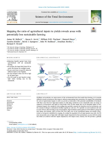 Fertilisers and pesticides are major sources of the environmental harm that results from farming, yet it remains difficult to target reductions in their impacts without compromising food production. We suggest that calculating the ratio of agrochemical inputs to yield can provide an indication of the potential sustainability of farmland, with those areas that have high input relative to yield being considered as less sustainable. Here we design an approach to characterise such Input to Yield Ratios (IYR) for four inputs that can be plausibly linked to environmental impacts: the cumulative risk resulting from pesticide exposure for honeybees and for earthworms, and the amount of nitrogen or phosphorus fertiliser applied per unit area. We capitalise on novel national-scale data to assess IYR for wheat farming across all of England. High-resolution spatial patterns of IYR differed among the four inputs, but hotspots, where all four IYRs were high, were in key agricultural regions not usually characterised as having low suitability for cropping. By scaling the magnitude of each input against crop yield, the IYR does not penalise areas of high yield with higher inputs (important for food production), or areas with low yields but which are achieved with low inputs (important as low impact areas). Instead, the IYR provides a globally applicable framework for evaluating the broad patterns of trade-offs between production and environmental risk, as an indicator of the potential for harm, over large scales. Its use can thus inform targeting to improve agricultural sustainability, or where one might switch to other land uses such as ecosystem restoration.