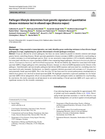 Pathogen lifestyle determines host genetic signature of quantitative disease resistance loci in oilseed rape (Brassica napus)