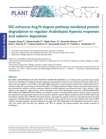 | Additional information | Change of title was BIG participates in the Arg/N-degron pathways and the hypoxia response in Arabidopsis thaliana now BIG enhances Arg/N-degron pathway-mediated protein degradation to regulate Arabidopsis hypoxia responses and suberin deposition Funding Work at Rothamsted Research was funded by the Biotechnology and Biological Sciences Research Council (BBSRC) through Grant BBS/E/C/000I0420 (Tailoring Plant Metabolism for the Bioeconomy Institute Strategic Programme) and Grant BB/X010988/1 (Green Engineering Institute Strategic Programme). Work at the University of Vienna was supported by grant F7904B from the Austrian Science Fund, FWF to A.B. Work at Maynooth University was supported by Science Foundation Ireland grant 13/IA/1870 to E.G. and by an Irish Research Council PhD scholarship (GOIPG/ 2017/2) to B.C.M. |